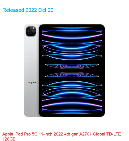 | Model | iPad Pro 5G 11-inch 2022 4th gen A2761 Global TD-LTE 128GB |