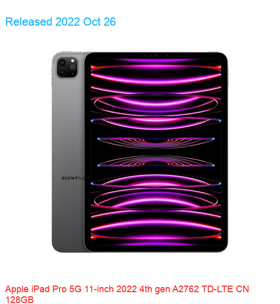 📅 LAUNCH: The Apple iPad Pro 5G 11-inch 2022 (4th Gen) A2762 TD-LTE CN 128GB was launched in October 2022.