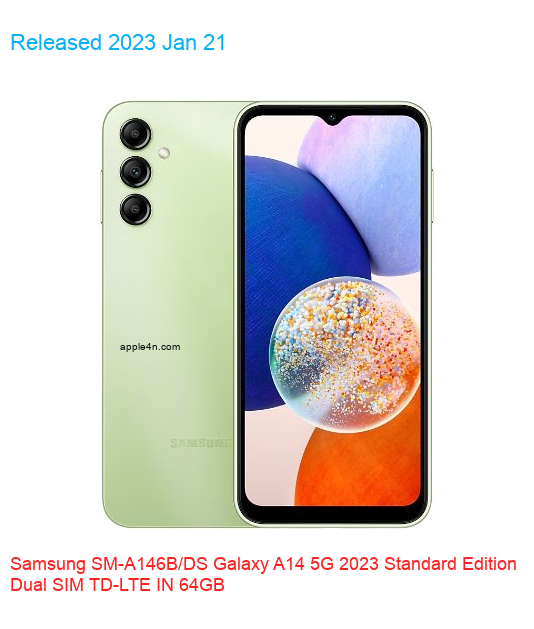 | Model | SM-A146B/DS Galaxy A14 5G 2023 Standard Edition Dual SIM TD-LTE IN 64GB |